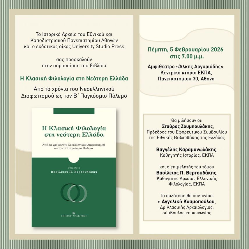 Το Ιστορικό Αρχείο του Εθνικού και Καποδιστριακού Πανεπιστημίου Αθηνών και ο εκδοτικός οίκος University Studio Press οργανώνουν την Πέμπτη, 5 Φεβρουαρίου 2026, στις 7.00 μ.μ. στο Αμφιθέατρο ‘Άλκης Αργυριάδης’, Κεντρικό κτήριο ΕΚΠΑ, Πανεπιστημίου 30, παρουσίαση-συζήτηση για το βιβλίο Η Κλασική Φιλολογία στη Νεότερη Ελλάδα. Από τα χρόνια του Νεοελληνικού Διαφωτισμού ως τον Β΄ Παγκόσμιο Πόλεμο (εκδ. University Studio Press, 2025).